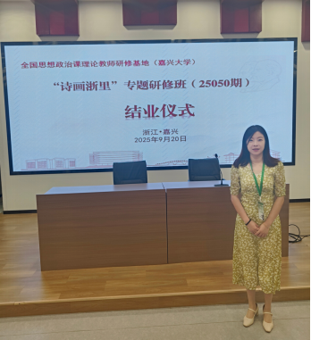 9月15日至20日,思政部副主任、骨干教师张媛前往浙江嘉兴,参加由教育部社科司主办、嘉兴大学承办的全国思想政治理论课教师研修基地“诗画浙里”专题研修班。